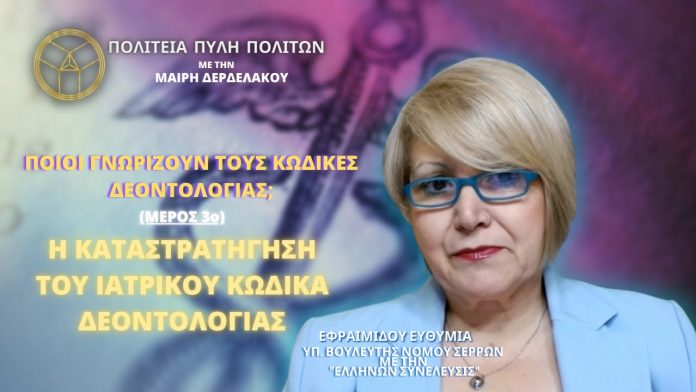 Η ΚΥΡΙΑ ΕΦΡΑΙΜΙΔΟΥ ΕΥΘΥΜΙΑ, ΥΠΟΨΗΦΙΑ ΒΟΥΛΕΥΤΗΣ ΣΤΟ ΝΟΜΟ ΣΕΡΡΩΝ ΜΕ ΤΟΝ ΠΟΛΙΤΙΚΟ ΦΟΡΕΑ ‘’ΕΛΛΗΝΩΝ ΣΥΝΕΛΕΥΣΙΣ’’ , ΜΙΛΑΕΙ ΓΙΑ ΤΟΥΣ ΚΩΔΙΚΕΣ ΔΕΟΝΤΟΛΟΓΙΑΣ ΚΑΙ ΑΠΟΔΕΙΚΝΥΕΙ ΤΗΝ ΚΑΤΑΣΤΡΑΤΗΓΗΣΗ ΤΟΥ ΙΑΤΡΙΚΟΥ ΚΩΔΙΚΑ ΣΤΗΝ ΕΚΠΟΜΠΗ ‘’ΠΟΛΙΤΕΙΑ ΠΥΛΗ ΠΟΛΙΤΩΝ’’ ΜΕ ΤΗΝ ΜΑΙΡΗ ΔΕΡΔΕΛΑΚΟΥ.
